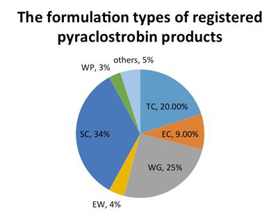With regard to formulations, pyraclostrobin is produced mostly in SC and WDG formulations, which account for over half of its formulations.?