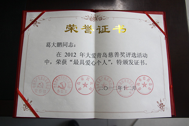 12月30日晚,青島市慈善總會2013年慈心童行元旦慈善晚宴在黃島飯店舉行。會上對2012年度“大愛青島慈善獎”評出的在助醫(yī)、助學(xué)、安老、慈孤、賑災(zāi)、義工服務(wù)等方面,做出突出貢獻的27個集體和50名愛心個人進行了表彰。海利爾藥業(yè)集團副總裁葛大鵬榮獲“最具愛心個人”榮耀稱號。????????