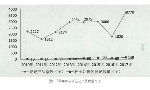??? 2017年新增登記產(chǎn)品3693個(gè),其中種子處理劑153個(gè),包括單劑85個(gè),混劑68個(gè)。