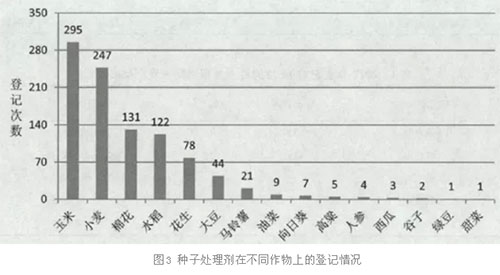 ??? 據(jù)統(tǒng)計(jì),我國(guó)現(xiàn)有的種子處理劑共在15種作物上取得登記,主要集中在玉米、小麥、棉花、水稻、花生、大豆(圖3),共涉及防治對(duì)象40多種,主要是蚜蟲、地下害蟲、土傳、種傳病害。苗期病害等。