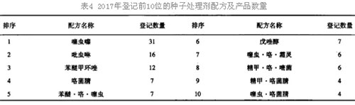 ??? 2017年新增登記的種子處理劑共涉及27種有效成分(表3),唑環(huán)菌胺、氯蟲苯甲酰胺等一批新品種已加入到種子處理產(chǎn)品的行列,產(chǎn)品結(jié)構(gòu)有了一定程度的優(yōu)化;共有登記配方50個(gè)(包括12種單劑產(chǎn)品),前10位的配方及其具體登記數(shù)量(表4),混配產(chǎn)品所占比重明顯增加;此外,毒性級(jí)別較高的農(nóng)藥品種已基本退出了舞臺(tái)。