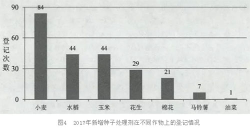 ??? 2017年新增登記的種子處理劑所涵蓋的作物種類共有8種,作物名稱及登記次數(shù)(圖4),主要集中于小麥、水稻、玉米這些大宗糧食作物上,占比約74.8%。與總的登記情況相比,小麥、水稻上登記的種子處理劑呈上升趨勢(shì),玉米、棉花的登記數(shù)量正逐漸下降,與我國(guó)種植業(yè)結(jié)構(gòu)調(diào)整密切相關(guān)。
