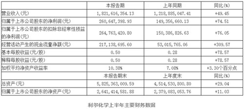 ??? 利爾化學(xué)股份有限公司(以下簡稱“利爾化學(xué)”)發(fā)布了2018年半年報顯示,利爾化學(xué)實現(xiàn)營業(yè)收入18.21億元,同比增長49.45%;實現(xiàn)歸屬于上市公司股東的凈利潤2.61億元,同比增長74.51%。