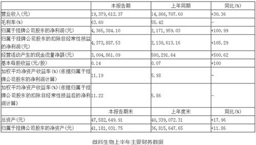 ??? 遼寧微科生物工程股份有限公司(下稱微科生物)2018年半年報顯示,公司實現(xiàn)營業(yè)收入0.19億元,同比增加30.36%。