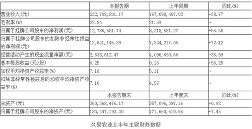 ??? 安徽久易農(nóng)業(yè)股份有限公司(下稱久易農(nóng)業(yè))2018年半年報顯示,公司資產(chǎn)總額達(dá)3.60億元,較期初增長0.92%;公司實現(xiàn)營業(yè)收入2.32億元,同比增長38.77%;營業(yè)收入和凈利潤較上年同期均有較大幅度增長,主要受供需結(jié)構(gòu)持續(xù)改善,產(chǎn)品銷量、產(chǎn)品價格、毛利率均有所上漲所致。