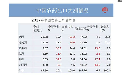 ??? 2017年,我國(guó)農(nóng)藥出口金額達(dá)到67.60億美元,同比增長(zhǎng)20.4%;出口量為146.76萬(wàn)噸,同比增長(zhǎng)6.9%。其中,原藥出口額為38.06億美元,占總出口額的56.3%;制劑出口額為29.54億美元,占總出口額的43.7%。長(zhǎng)期以來(lái)以原藥出口為主的出口產(chǎn)品格局正在發(fā)生變化,我國(guó)農(nóng)藥出口的產(chǎn)品結(jié)構(gòu)逐步趨向合理。2017年我國(guó)農(nóng)藥制劑出口量達(dá)到96.13萬(wàn)噸,農(nóng)藥原藥出口量達(dá)到50.63萬(wàn)噸,我國(guó)農(nóng)藥出口的角色正從原料供應(yīng)商向終端產(chǎn)品制造商轉(zhuǎn)變。