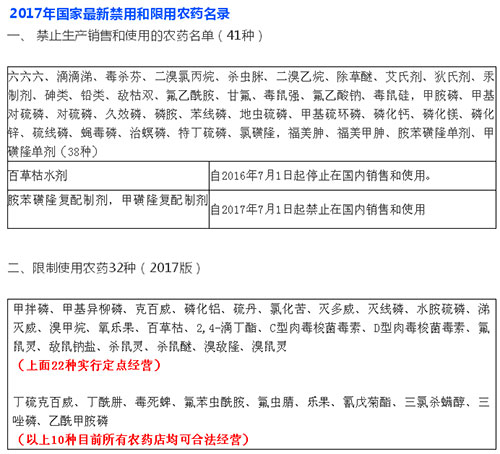 ??? 也就是說(shuō)只有獲得定點(diǎn)經(jīng)營(yíng)資格的農(nóng)藥經(jīng)營(yíng)點(diǎn)才可以銷售以上農(nóng)藥,不過(guò)根據(jù)農(nóng)業(yè)農(nóng)村部2017年出臺(tái)的《限制使用農(nóng)藥名錄(2017版)》,里面標(biāo)注的限制使用農(nóng)藥共有32種,其中就包括目前使用量較大的毒死蜱、丁硫克百威、樂(lè)果這些產(chǎn)品。