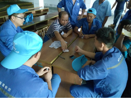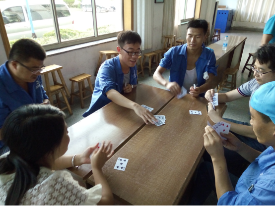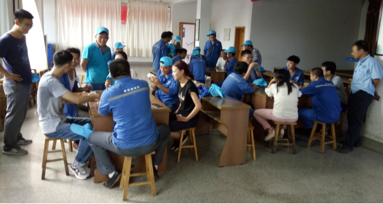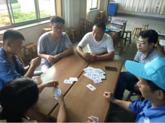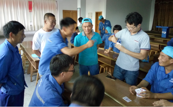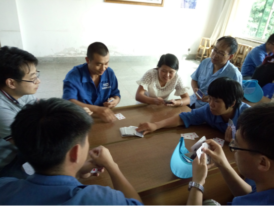 務(wù)實(shí)隊(duì)&正直隊(duì)最先結(jié)束對抗,正直隊(duì)勝出,他們的表情也非常輕松,看來早已是勝券在握啊。誠信隊(duì)&超越隊(duì)在比賽過程中就比賽規(guī)則有一些小爭執(zhí),我們看到裁判員已經(jīng)在進(jìn)行調(diào)節(jié)。比賽繼續(xù)進(jìn)行,超越隊(duì)勝出。坦誠隊(duì)&感恩隊(duì)在比賽的尾聲出現(xiàn)了逆轉(zhuǎn),原本感恩隊(duì)的陳雷、陳雅雯想悶掉坦誠隊(duì)的原廠長,但無奈原廠長變換了出牌方式,以致對方無法實(shí)施原計(jì)劃戰(zhàn)術(shù),最后坦誠隊(duì)勝出。在陽光隊(duì)&服務(wù)隊(duì)的對抗中,實(shí)力雄厚的陽光隊(duì)也輕松勝出。