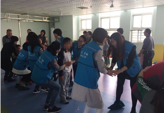 走到二樓活動(dòng)室,正好趕上他們互動(dòng)游戲課程,這些孩子對(duì)陌生人都有一定的抵觸感,所以在老師的引導(dǎo)下,志愿者們通過簡(jiǎn)單的互動(dòng)、自我介紹、擁抱等方式建立了初步友誼,小朋友們慢慢的笑起來。